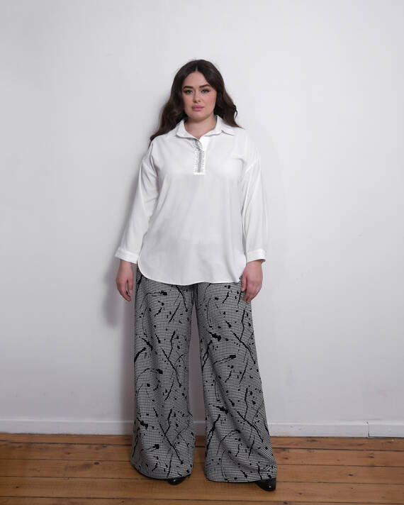 Kazayağı üzer flok baskılı bol paça pantolon
